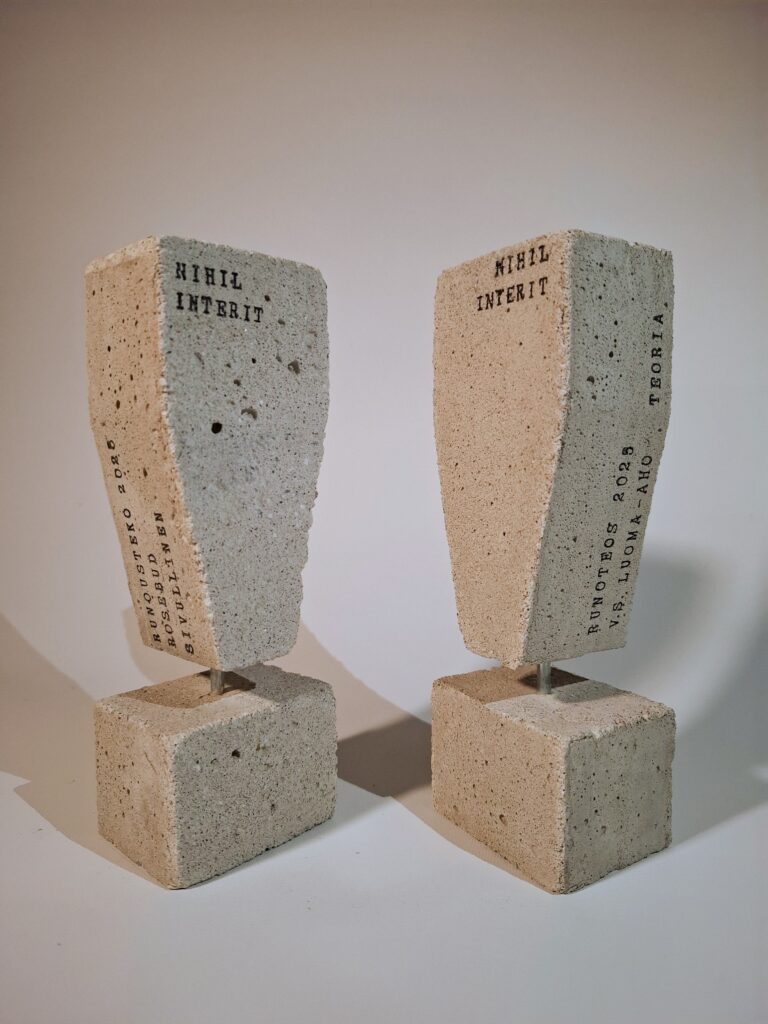 Toteutin runouspalkintoesineet betonivaluina ja merkitsin ne leimasimia käyttäen. Esineet edustavat välimerkki-teemaa, jota olen käyttänyt viime aikoina työskentelyssäni aseemisen taiteen parissa.